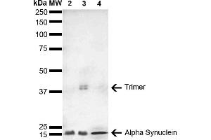 - Expressed principally in brain but is also expressed in low concentrations in all tissues examined except in liver. Concentrated in presynaptic nerve terminals.,Binds multiple linear epitopes within human ASYN: 21-70 aa, 61-90 aa, and 101-140 aa, determined using DB & ELISA with corresponding peptides. Detects ~14 kDa band corr to ASYN. ~40 kDa is a trimer.