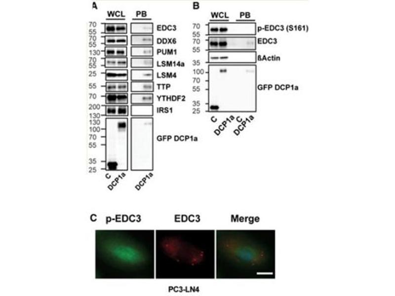 Immunogen: EDC3 affinity purified antibody was prepared from whole rabbit serum produced by repeated immunizations with a synthetic phospho-peptide surrounding the pS161 site of mouse EDC3.