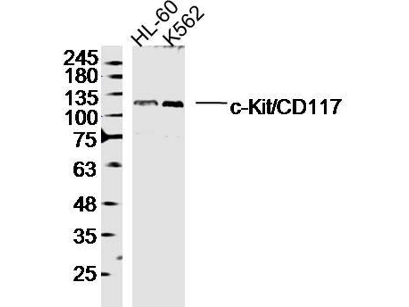 Background: Tyrosine-protein kinase that acts as cell-surface receptor for the cytokine KITLG/SCF and plays an essential role in the regulation of cell survival and proliferation, hematopoiesis, stem cell maintenance, gametogenesis, mast cell development, migration and function, and in melanogenesis. In response to KITLG/SCF binding, KIT can activate several signaling pathways. Phosphorylates PIK3R1, PLCG1, SH2B2/APS and CBL. Activates the AKT1 signaling pathway by phosphorylation of PIK3R1, the regulatory subunit of phosphatidylinositol 3-kinase. Activated KIT also transmits signals via GRB2 and activation of RAS, RAF1 and the MAP kinases MAPK1/ERK2 and/or MAPK3/ERK1. Promotes activation of STAT family members STAT1, STAT3, STAT5A and STAT5B. Activation of PLCG1 leads to the production of the cellular signaling molecules diacylglycerol and inositol 1,4,5-trisphosphate. KIT signaling is modulated by protein phosphatases, and by rapid internalization and degradation of the receptor. Activated KIT promotes phosphorylation of the protein phosphatases PTPN6/SHP-1 and PTPRU, and of the transcription factors STAT1, STAT3, STAT5A and STAT5B. Promotes phosphorylation of PIK3R1, CBL, CRK (isoform Crk-II), LYN, MAPK1/ERK2 and/or MAPK3/ERK1, PLCG1, SRC and SHC1.