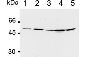 In eukaryotic cells, 3 types of DNA polymerases (pol), pol alpha, pol delta and pol epsilon function in accurate and efficient DNA replication. Pol delta is a heteromultimeric enzyme composed of a 125 kDa major catalytic subunit and three smaller accessory subunits. Pol delta requires a number of accessory molecules to exert its full activity. Proliferating cell nuclear antigen (PCNA) forms a doughnut-shaped trimer with a 35 Ä hole and works as the sliding clamp and replication factor C acts as the clamp loader to improve Pol delta processivity. Pol delta is also involved in nucleotide excision repair of DNA.Synonyms: DNA polymerase delta subunit 2, DNA polymerase delta subunit p50