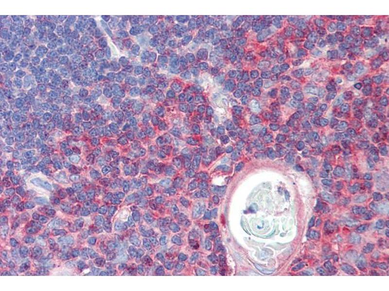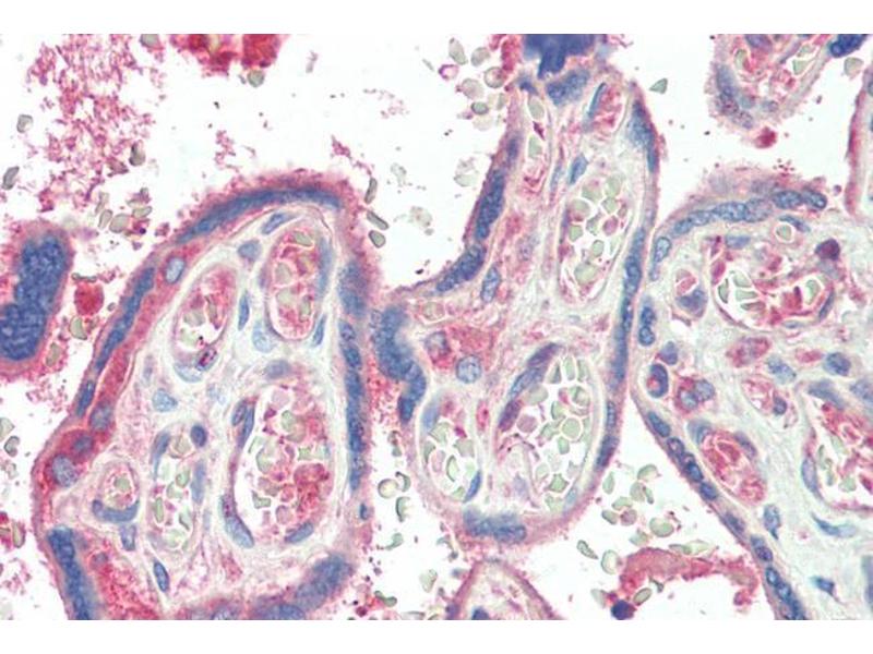 Immunohistochemistry: Paraffin embedded Human Thymus and Placenta. Recommended concentration: 5 μg/mL.