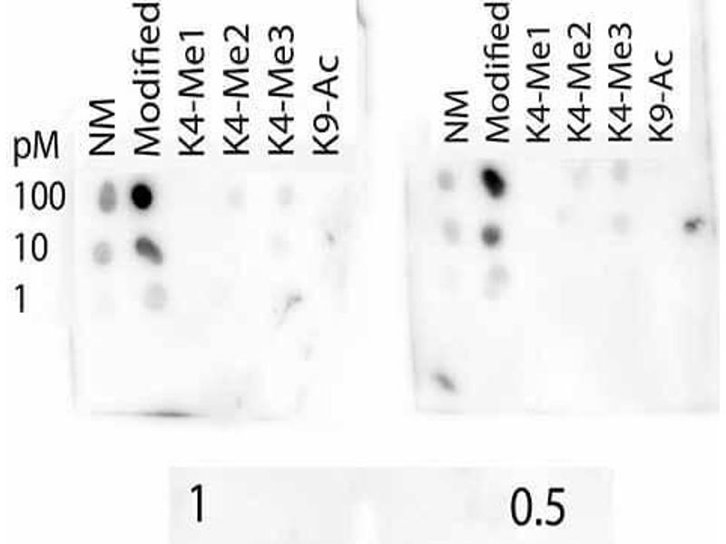 - Anti-Histone H3 [Trimethyl Lys4/ac Lys9] was affinity purified from monospecific antiserum by immunoaffinity chromatography.