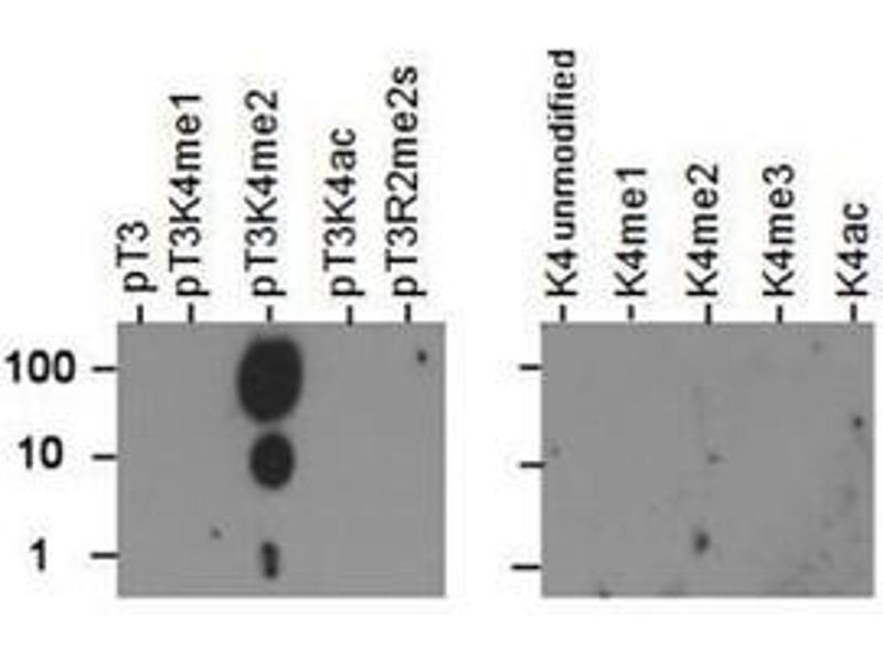 - Anti-Histone H3 [Dimethyl Lys4, p Thr3] was affinity purified from monospecific antiserum by immunoaffinity chromatography.