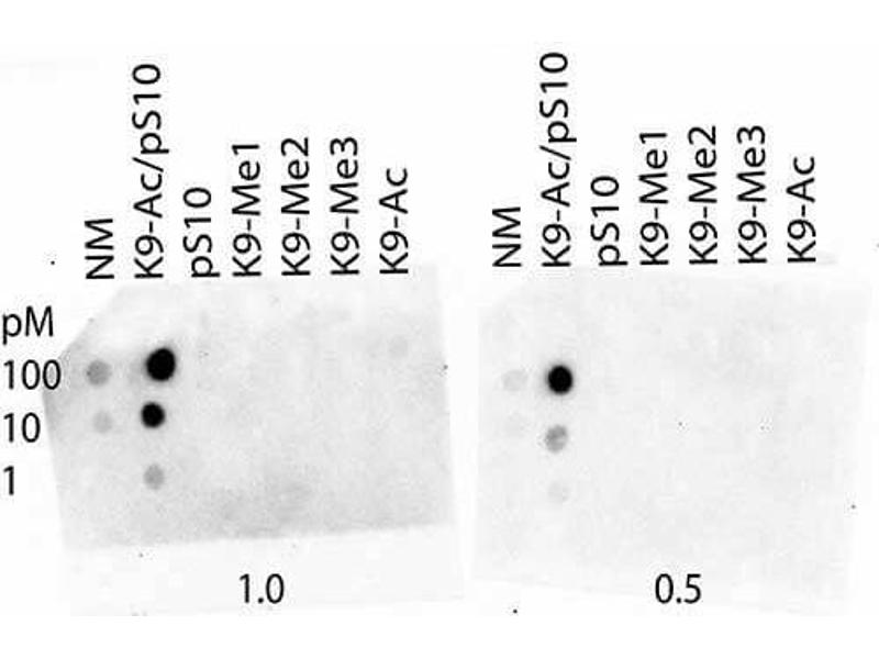 - Anti-Histone H3 K9Ac/pS10 was affinity purified from monospecific antiserum by immunoaffinity chromatography.