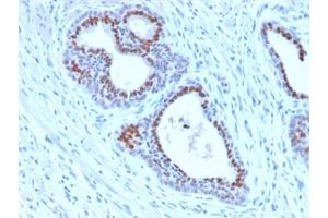 The transcription factor Forkhead-box A1, also known as hepatocyte nuclear factor 3-alpha, is a member of the FOX class of transcription factors. HNF-1 (α, and β,), HNF-3 (α, β, and γ,), HNF-4 (α, and γ,), and HNF-6 compose, in part, a homeoprotein family designated the hepatocyte nuclear factor family. The various HNF-1 isoforms regulate transcription of genes in the liver as well as in other tissues such as kidney, small intestine and thymus. FOXA1 is expressed in normal breast ductal epithelium and other epithelium in different organs, such as lung, pancreas, bladder, prostate, and colon. Recently, FOXA1 has been shown to be a major determinant of estrogen-ER activity and endocrine response in breast cancer cells. Its expression correlates with estrogen receptor (ER)-positivity, especially in luminal subtype A breast cancers, which is associated with favorable prognosis. FOXA1 is useful in the sub-classification of breast carcinomas.