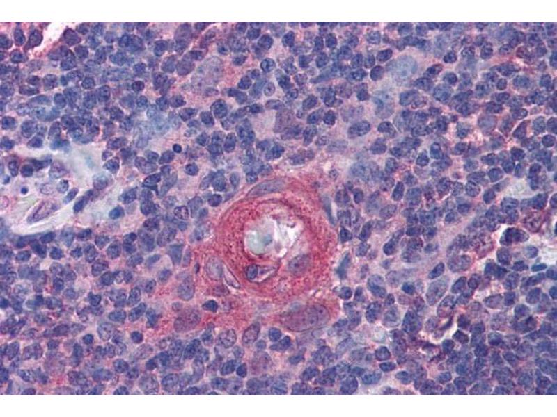 Immunohistochemistry: In paraffin embedded Human Lymph Node shows membrane staining just outside the mantle zone of the Germinal Centre. Recommended concentration: 1-2 μg/mL. Paraffin embedded Human Tonsil and Thymus. Recommended concentration: 3.75 μg/mL.