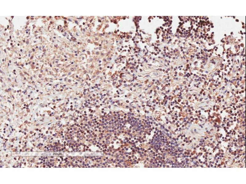 Western Blot: Preliminary experiments gave an approx 13 kDa band in Human Peripheral Blood Lymphocyte lysates after 0.01 μg/mL antibody staining. Please note that currently we cannot find an explanation in the literature for the band we observe given the c