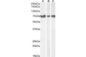 Western Blot: Approx. 75 kDa band observed in Human Pancreas, Heart and Skeletal Muscle lysates (calculated MW of 75.2 kDa according to NP_079470.1). Recommended concentration: 1-3 μg/mL.