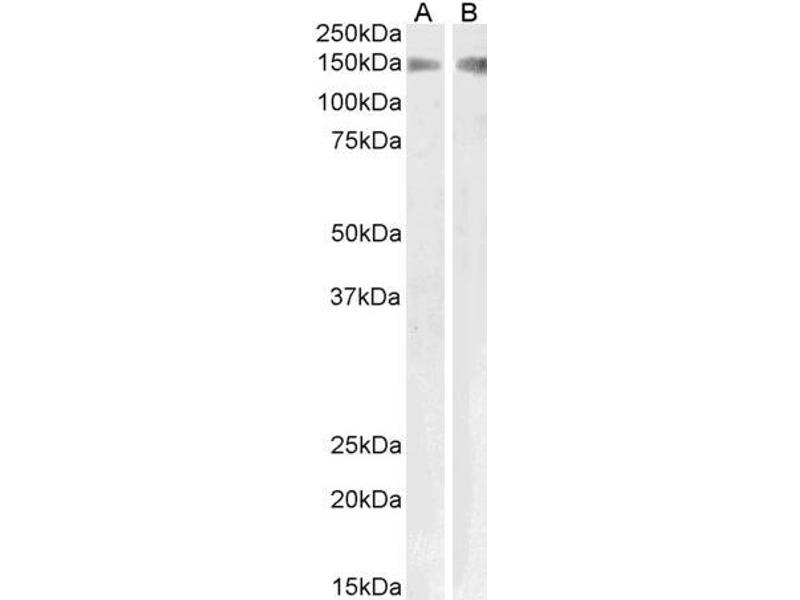 Western Blot: Preliminary testing showed a band at approx 150 kDa in HeLa cell lysate after 2 μg/mL antibody staining (calculated MW of 153 kDa according to NP_001007268.1 Primary incubation 1 hour at room temperature.