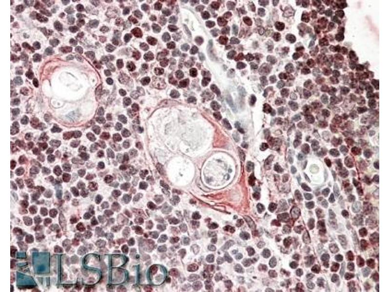 Immunohistochemistry: In paraffin embedded Human Thymus shows select nuclear staining. Recommended concentration: 3-5 μg/mL.