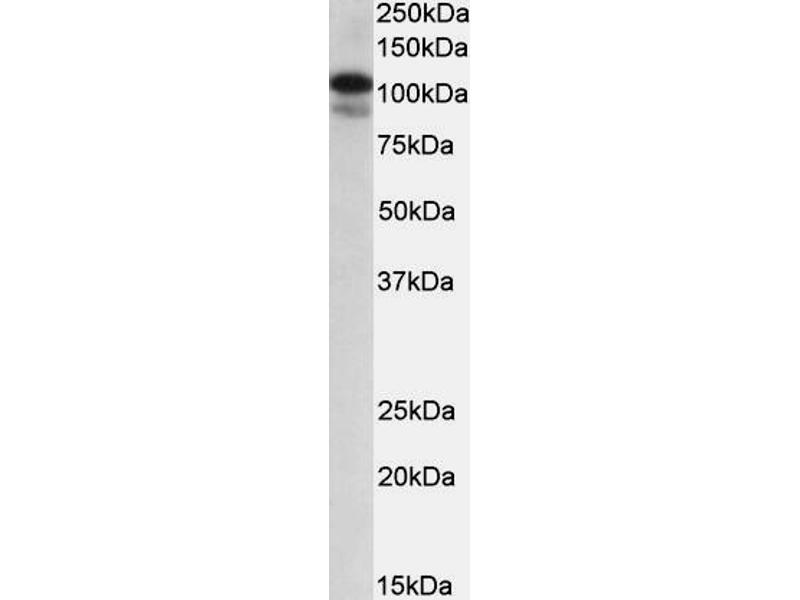 Western Blot: Approx. 90 kDa band observed in nuclear lysates of cell lines A431 and Jurkat and in lysates of cell lines U251 and Daudi (calculated MW of 89.0 kDa according to NP_001182399.1). Recommended concentration: 0.1-0.5 μg/mL. Primary incubation 1 h