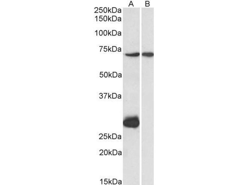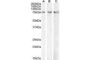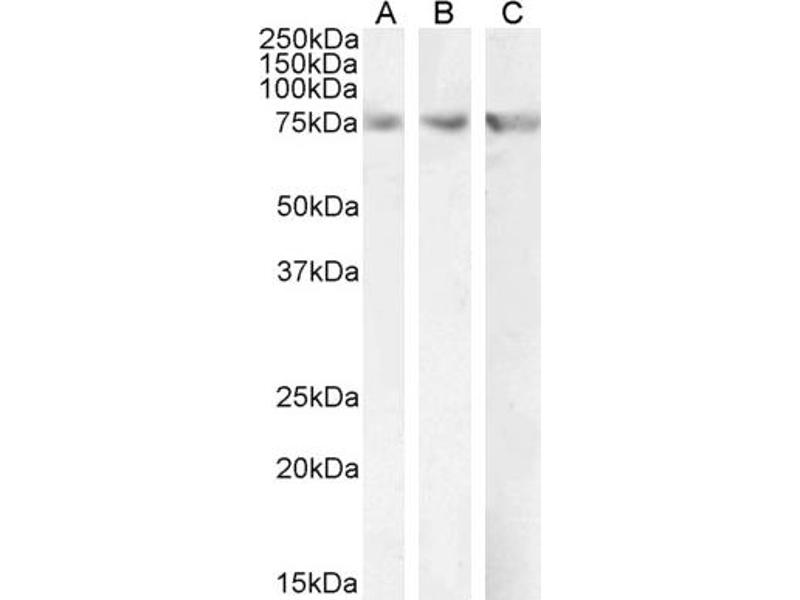 Western Blot: Approx 75 kDa band observed in Rat Heart and in Mouse Liver lysates and approx 70-75 kDa doublet in Human Liver lysates (calculated MW of 73.8 kDa according to Human NP_000089.1 and 74.0 kDa according to Mouse NP_034079.2 and Rat NP_037062.1)