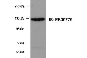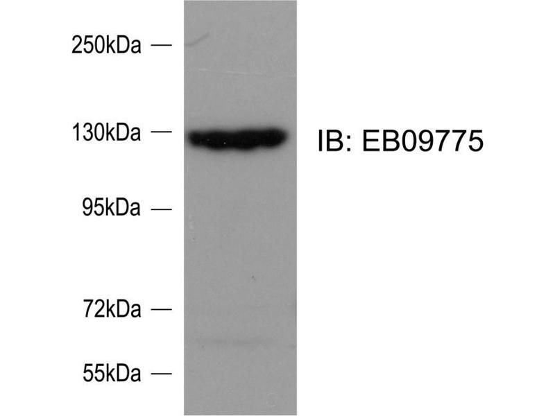 Western Blot: Approx 124 kDa band observed in lysates of cell line HeLa and in rat primary culture cortical neurons at Day 4 (calculated MW of 121 kDa according to human NP_056141.2 but the rat protein sequence is stlll provisional). Recommended concentrat