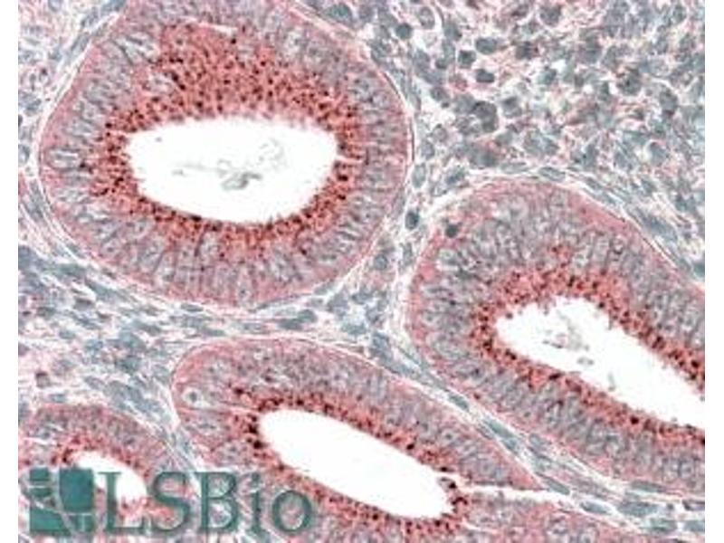 Immunohistochemistry: In paraffin embedded Human Uterus shows vesicular staining in the cytoplasm of endometrial epithelium. Recommended concentration, 3-5 μg/mL.
