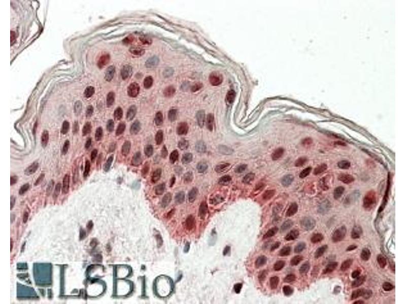 Immunohistochemistry: In paraffin embedded Human Skin shows staining of select keratinocytes. Recommended concentration, 3-5 μg/mL.