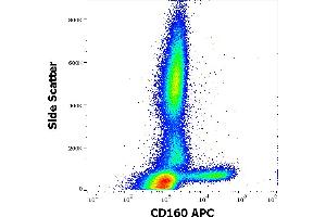 The mouse monoclonal antibody BY55 recognizes an extracellular epitope of CD160, a 27 kDa glycoprotein expressed on NK cells, NK-T cells, intestinal intraepithelial lymphocytes, TCR-gamma/delta T cells and a small population of TCR-alpha/beta T cells. The antibody detects both GPI-anchored and transmembrane form of CD160.