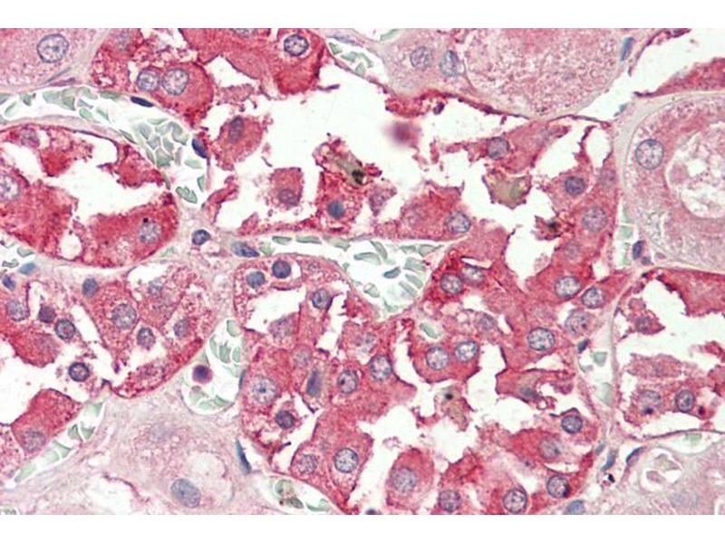 Western Blot: Approx 60 kDa band observed in Human Testis lysates (calculated MW of 53.2 kDa according to NP_057405.1). The observed molecular weight corresponds to earlier findings in literature with different antibodies (Liu et al, J Biol Chem. 2000 Aug