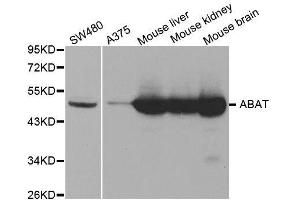 - 4-aminobutyrate aminotransferase (ABAT) is responsible for catabolism of gamma-aminobutyric acid (GABA), an important, mostly inhibitory neurotransmitter in the central nervous system, into succinic semialdehyde. The active enzyme is a homodimer of 50-kD subunits complexed to pyridoxal-5-phosphate. The protein sequence is over 95 % similar to the pig protein. GABA is estimated to be present in nearly one-third of human synapses. ABAT in liver and brain is controlled by 2 codominant alleles with a frequency in a Caucasian population of 0.56 and 0.44. The ABAT deficiency phenotype includes psychomotor retardation, hypotonia, hyperreflexia, lethargy, refractory seizures, and EEG abnormalities. Multiple alternatively spliced transcript variants encoding the same protein isoform have been found for this gene.,ABAT,GABA-AT,GABAT,NPD009,Cancer,Signal Transduction,Endocrine & Metabolism,Mitochondrial metabolism,Mitochondrial markers,Amino acid metabolism,Neuroscience,Neurodegenerative Diseases Markers,Other Neurological disorders,ABAT