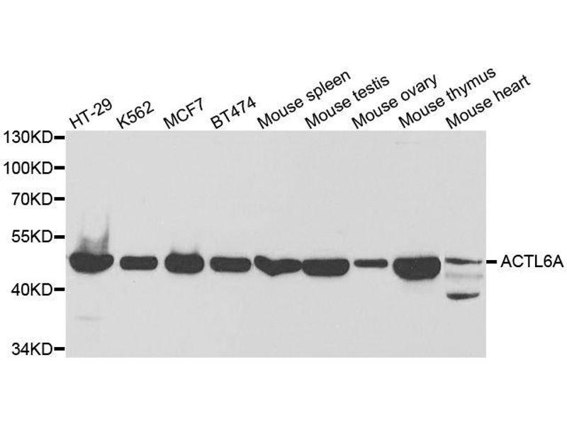 - This gene encodes a family member of actin-related proteins (ARPs), which share significant amino acid sequence identity to conventional actins. Both actins and ARPs have an actin fold, which is an ATP-binding cleft, as a common feature. The ARPs are involved in diverse cellular processes, including vesicular transport, spindle orientation, nuclear migration and chromatin remodeling. This gene encodes a 53 kDa subunit protein of the BAF (BRG1/brm-associated factor) complex in mammals, which is functionally related to SWI/SNF complex in S. cerevisiae and Drosophila, the latter is thought to facilitate transcriptional activation of specific genes by antagonizing chromatin-mediated transcriptional repression. Together with beta-actin, it is required for maximal ATPase activity of BRG1, and for the association of the BAF complex with chromatin/matrix. Three transcript variants that encode two different protein isoforms have been described.,ACTL6A,ACTL6,ARPN-BETA,Arp4,BAF53A,INO80K,Epigenetics & Nuclear Signaling,Chromatin Remodeling,Signal Transduction,Cell Biology & Developmental Biology,Cytoskeleton,Microfilaments,ACTL6A