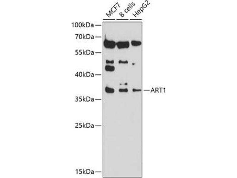 - ADP-ribosyltransferase catalyzes the ADP-ribosylation of arginine residues in proteins. Mono-ADP-ribosylation is a posttranslational modification of proteins that is interfered with by a variety of bacterial toxins including cholera, pertussis, and heat-labile enterotoxins of E. coli. The amino acid sequence consists of predominantly hydrophobic N- and C-terminal regions, which is characteristic of glycosylphosphatidylinositol (GPI)-anchored proteins. This gene was previously designated ART2.,ART1,ART2,ARTC1,CD296,RT6,Epigenetics & Nuclear Signaling,Immunology & Inflammation,CD markers,ART1