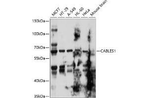 - This gene encodes a protein involved in regulation of the cell cycle through interactions with several cyclin-dependent kinases. One study (PMID: 16177568) reported aberrant splicing of transcripts from this gene which results in removal of the cyclin binding domain only in human cancer cells, and reduction in gene expression was shown in colorectal cancers (PMID: 17982127).Multiple transcript variants encoding different isoforms have been found for this gene.,CABLES1,CABL1,CABLES,HsT2563,IK3-1,Kinase,Cell Biology & Developmental Biology,Cell Cycle,CABLES1