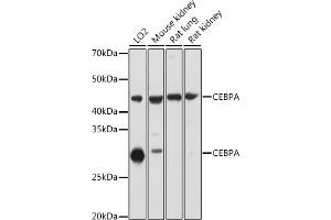 This intronless gene encodes a transcription factor that contains a basic leucine zipper (bZIP) domain and recognizes the CCAAT motif in the promoters of target genes. The encoded protein functions in homodimers and also heterodimers with CCAAT/enhancer-binding proteins beta and gamma. Activity of this protein can modulate the expression of genes involved in cell cycle regulation as well as in body weight homeostasis. Mutation of this gene is associated with acute myeloid leukemia. The use of alternative in-frame non-AUG (GUG) and AUG start codons results in protein isoforms with different lengths. Differential translation initiation is mediated by an out-of-frame, upstream open reading frame which is located between the GUG and the first AUG start codons.,CEBPA,C/EBP-alpha,CEBP,Epigenetics & Nuclear Signaling,Transcription Factors,Cancer,Signal Transduction,Endocrine & Metabolism,Cardiovascular,Lipids,Fatty Acids,CEBPA