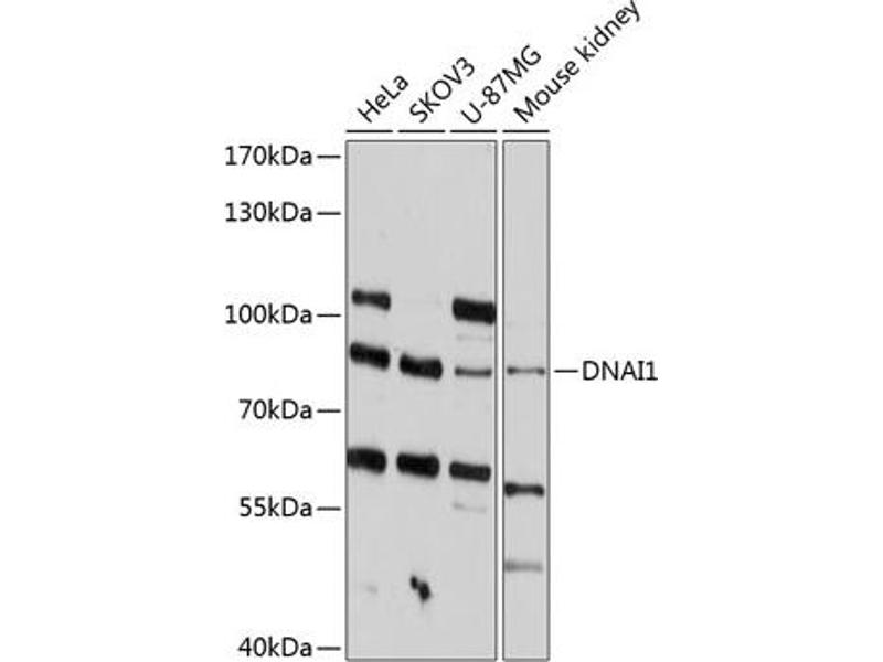 This gene encodes a member of the dynein intermediate chain family. The encoded protein is part of the dynein complex in respiratory cilia. The inner- and outer-arm dyneins, which bridge between the doublet microtubules in axonemes, are the force-generating proteins responsible for the sliding movement in axonemes. The intermediate and light chains, thought to form the base of the dynein arm, help mediate attachment and may also participate in regulating dynein activity. Mutations in this gene result in abnormal ciliary ultrastructure and function associated with primary ciliary dyskinesia and Kartagener syndrome. Alternative splicing results in multiple transcript variants.,DNAI1,CILD1,DIC1,ICS1,PCD,Signal Transduction,Cell Biology & Developmental Biology,Cell Adhesion,Cytoskeleton,Microtubules,Motor Proteins,Neuroscience,Cell Type Marker,Neurodegenerative Diseases,Neuron marker,Axon marker,DNAI1
