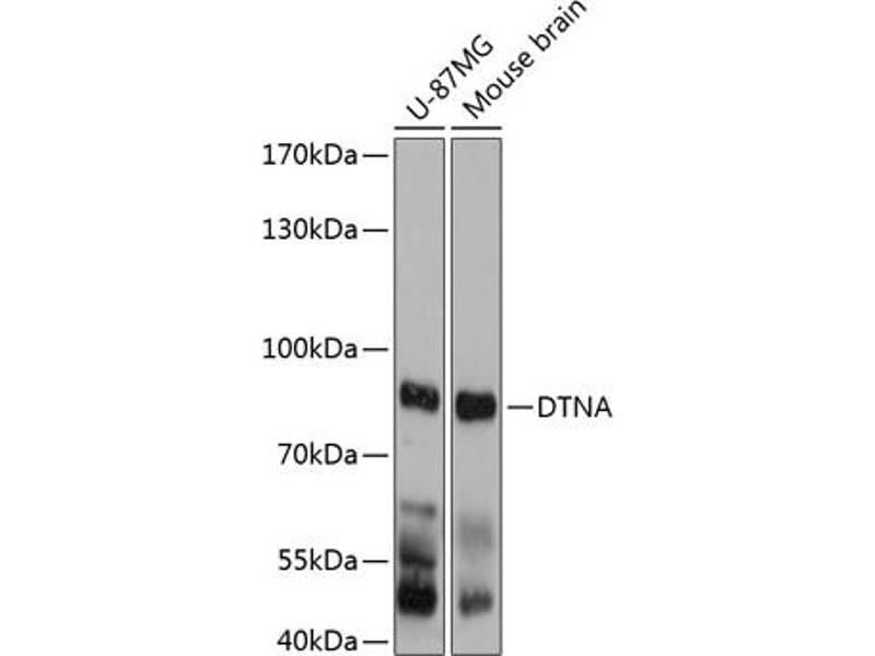 - The protein encoded by this gene belongs to the dystrobrevin subfamily of the dystrophin family. This protein is a component of the dystrophin-associated protein complex (DPC), which consists of dystrophin and several integral and peripheral membrane proteins, including dystroglycans, sarcoglycans, syntrophins and alpha- and beta-dystrobrevin. The DPC localizes to the sarcolemma and its disruption is associated with various forms of muscular dystrophy. Mutations in this gene are associated with left ventricular noncompaction with congenital heart defects. Multiple alternatively spliced transcript variants encoding different isoforms have been identified for this gene.,DTNA,D18S892E,DRP3,DTN,DTN-A,LVNC1,Signal Transduction,Cell Biology & Developmental Biology,Cell Adhesion,Tight Junctions,Cytoskeleton,Neuroscience,Cell Type Marker,Neuron marker,Synapse marker,DTNA