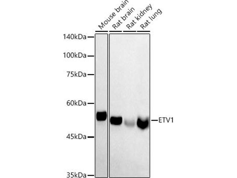 - This gene encodes a member of the ETS (E twenty-six) family of transcription factors. The ETS proteins regulate many target genes that modulate biological processes like cell growth, angiogenesis, migration, proliferation and differentiation. All ETS proteins contain an ETS DNA-binding domain that binds to DNA sequences containing the consensus 5'-CGGA[AT]-3'. The protein encoded by this gene contains a conserved short acidic transactivation domain (TAD) in the N-terminal region, in addition to the ETS DNA-binding domain in the C-terminal region. This gene is involved in chromosomal translocations, which result in multiple fusion proteins including EWS-ETV1 in Ewing sarcoma and at least 10 ETV1 partners (see PMID: 19657377, Table 1) in prostate cancer. In addition to chromosomal rearrangement, this gene is overexpressed in prostate cancer, melanoma and gastrointestinal stromal tumor. Multiple alternatively spliced transcript variants encoding different isoforms have been identified.,ETV1,ER81,Epigenetics & Nuclear Signaling,Transcription Factors,Signal Transduction,MAPK-Erk Signaling Pathway,MAPK-P38 Signaling Pathway,Neuroscience,Stem Cells,Hematopoietic Progenitors,ETV1