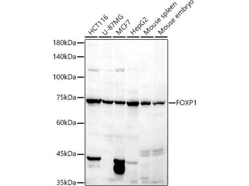- This gene belongs to subfamily P of the forkhead box (FOX) transcription factor family. Forkhead box transcription factors play important roles in the regulation of tissue- and cell type-specific gene transcription during both development and adulthood. Forkhead box P1 protein contains both DNA-binding- and protein-protein binding-domains. This gene may act as a tumor suppressor as it is lost in several tumor types and maps to a chromosomal region (3p14.1) reported to contain a tumor suppressor gene(s). Alternative splicing results in multiple transcript variants encoding different isoforms.,FOXP1,12CC4,HSPC215,MFH,QRF1,hFKH1B,Epigenetics & Nuclear Signaling,Cancer,Tumor suppressors,FOXP1