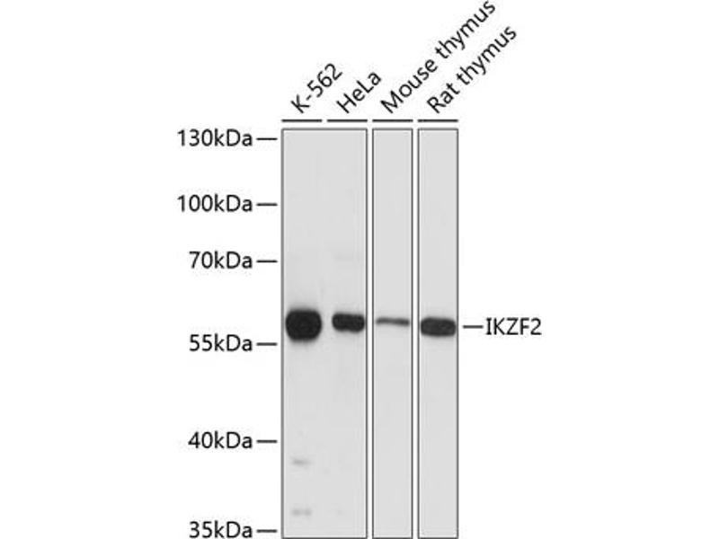 - This gene encodes a member of the Ikaros family of zinc-finger proteins. Three members of this protein family (Ikaros, Aiolos and Helios) are hematopoietic-specific transcription factors involved in the regulation of lymphocyte development. This protein forms homo- or hetero-dimers with other Ikaros family members, and is thought to function predominantly in early hematopoietic development. Multiple transcript variants encoding different isoforms have been found for this gene, but the biological validity of some variants has not been determined.,IKZF2,ANF1A2,HELIOS,ZNF1A2,ZNFN1A2,Epigenetics & Nuclear Signaling,Transcription Factors,IKZF2