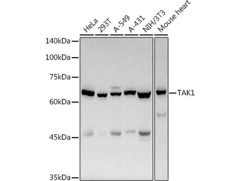The protein encoded by this gene is a member of the serine/threonine protein kinase family. This kinase mediates the signaling transduction induced by TGF beta and morphogenetic protein (BMP), and controls a variety of cell functions including transcription regulation and apoptosis. In response to IL-1, this protein forms a kinase complex including TRAF6, MAP3K7P1/TAB1 and MAP3K7P2/TAB2, this complex is required for the activation of nuclear factor kappa B. This kinase can also activate MAPK8/JNK, MAP2K4/MKK4, and thus plays a role in the cell response to environmental stresses. Four alternatively spliced transcript variants encoding distinct isoforms have been reported.,CSCF,FMD2,MEKK7,TAK1,TGF1a,MAP3K7,Cancer,Signal Transduction,G protein signaling,G2/M DNA Damage Checkpoint,Kinase,Serine/threonine kinases,Tyrosine kinases,MAPK-Erk Signaling Pathway,MAPK-JNK Signaling Pathway,MAPK-P38 Signaling Pathway,Cell Biology & Developmental Biology,Apoptosis,Inhibition of Apoptosis,Cytoskeleton,Actins,TGF-b-Smad Signaling Pathway,Wnt/β-Catenin Signaling Pathway,Immunology & Inflammation,B Cell Receptor Signaling Pathway,T Cell Receptor Signaling Pathway,NF-kB Signaling Pathway,Toll-like Receptor Signaling Pathway,Cell Intrinsic Innate Immunity Signaling Pathway,TLR Signaling,Cardiovascular,MAP3K7