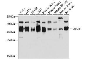 The product of this gene is a member of the OTU (ovarian tumor) superfamily of predicted cysteine proteases. The encoded protein is a highly specific ubiquitin iso-peptidase, and cleaves ubiquitin from branched poly-ubiquitin chains but not from ubiquitinated substrates. It interacts with another ubiquitin protease and an E3 ubiquitin ligase that inhibits cytokine gene transcription in the immune system. It is proposed to function in specific ubiquitin-dependent pathways, possibly by providing an editing function for polyubiquitin chain growth. Alternative splicing results in multiple transcript variants.,OTUB1,HSPC263,OTB1,OTU1,Epigenetics & Nuclear Signaling,DNA Damage & Repair,Cell Biology & Developmental Biology,Ubiquitin,OTUB1