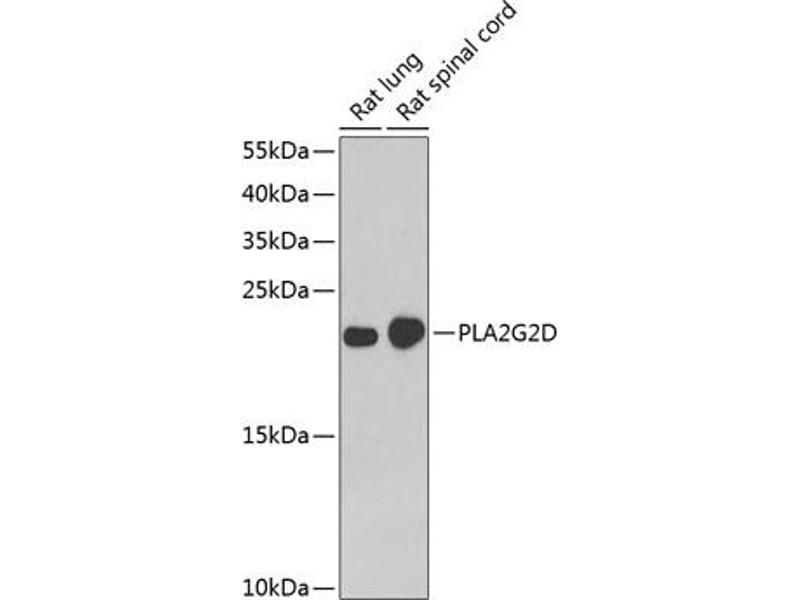 - This gene encodes a secreted member of the phospholipase A2 family, and is found in a cluster of related family members on chromosome 1. Phospholipase A2 family members hydrolyze the sn-2 fatty acid ester bond of glycerophospholipids to produce lysophospholipids and free fatty acid. This gene may be involved in inflammation and immune response, and in weight loss associated with chronic obstructive pulmonary disease. Alternative splicing results in multiple transcript variants encoding different isoforms.,PLA2G2D,PLA2IID,SPLASH,sPLA2-IID,sPLA2S,Cancer,Signal Transduction,Cell Biology & Developmental Biology,Cell Cycle,Centrosome,Endocrine & Metabolism,Lipid Metabolism,Lipases,Cardiovascular,Lipids,PLA2G2D