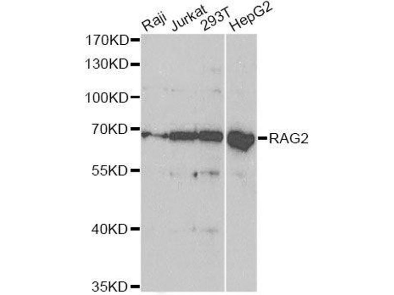 - This gene encodes a protein that is involved in the initiation of V(D)J recombination during B and T cell development. This protein forms a complex with the product of the adjacent recombination activating gene 1, and this complex can form double-strand breaks by cleaving DNA at conserved recombination signal sequences. The recombination activating gene 1 component is thought to contain most of the catalytic activity, while the N-terminal of the recombination activating gene 2 component is thought to form a six-bladed propeller in the active core that serves as a binding scaffold for the tight association of the complex with DNA. A C-terminal plant homeodomain finger-like motif in this protein is necessary for interactions with chromatin components, specifically with histone H3 that is trimethylated at lysine 4. Mutations in this gene cause Omenn syndrome, a form of severe combined immunodeficiency associated with autoimmune-like symptoms.,RAG2,RAG-2,Epigenetics & Nuclear Signaling,DNA Damage & Repair,RAG2