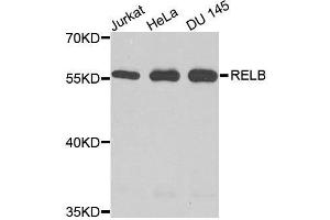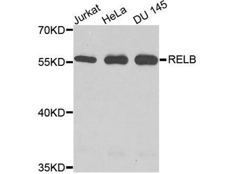 - NF-kappa-B is a pleiotropic transcription factor which is present in almost all cell types and is involved in many biological processed such as inflammation, immunity, differentiation, cell growth, tumorigenesis and apoptosis. NF-kappa-B is a homo- or heterodimeric complex formed by the Rel-like domain-containing proteins RELA/p65, RELB, NFKB1/p105, NFKB1/p50, REL and NFKB2/p52. NF-kappa-B is controlled by various mechanisms of post-translational modification and subcellular compartmentalization as well as by interactions with other cofactors or corepressors. NF-kappa-B complexes are held in the cytoplasm in an inactive state complexed with members of the NF-kappa-B inhibitor (I-kappa-B) family. In a conventional activation pathway, I-kappa-B is phosphorylated by I-kappa-B kinases (IKKs) in response to different activators, subsequently degraded thus liberating the active NF-kappa-B complex which translocates to the nucleus. NF-kappa-B heterodimeric RelB-p50 and RelB-p52 complexes are transcriptional activators. RELB neither associates with DNA nor with RELA/p65 or REL. Stimulates promoter activity in the presence of NFKB2/p49. Increased repression of the heterodimer is seen in the presence of NFKB2/p52. Is required for both T and B lymphocyte maturation and function.,RELB,I-REL,IREL,REL-B,Epigenetics & Nuclear Signaling,Transcription Factors,Cancer,Signal Transduction,Cell Biology & Developmental Biology,Apoptosis,Inhibition of Apoptosis,Death Receptor Signaling Pathway,Immunology & Inflammation,B Cell Receptor Signaling Pathway,T Cell Receptor Signaling Pathway,NF-kB Signaling Pathway,RELB