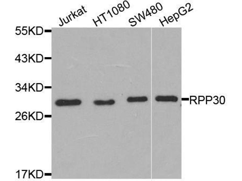 - Component of ribonuclease P, a ribonucleoprotein complex that generates mature tRNA molecules by cleaving their 5'-ends. Also a component of the MRP ribonuclease complex, which cleaves pre-rRNA sequences.,RPP30,TSG15,Epigenetics & Nuclear Signaling,RNA Binding,Endocrine & Metabolism,Mitochondrial metabolism,RPP30