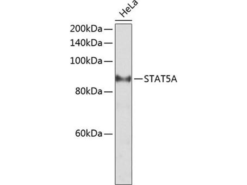 The protein encoded by this gene is a member of the STAT family of transcription factors. In response to cytokines and growth factors, STAT family members are phosphorylated by the receptor associated kinases, and then form homo- or heterodimers that translocate to the cell nucleus where they act as transcription activators. This protein is activated by, and mediates the responses of many cell ligands, such as IL2, IL3, IL7 GM-CSF, erythropoietin, thrombopoietin, and different growth hormones. Activation of this protein in myeloma and lymphoma associated with a TEL/JAK2 gene fusion is independent of cell stimulus and has been shown to be essential for tumorigenesis. The mouse counterpart of this gene is found to induce the expression of BCL2L1/BCL-X(L), which suggests the antiapoptotic function of this gene in cells. Alternatively spliced transcript variants have been found for this gene.,MGF,STAT5,STAT5A,Epigenetics & Nuclear Signaling,Transcription Factors,Signal Transduction,ErbB-HER Signaling Pathway,Cell Biology & Developmental Biology,Apoptosis,Immunology & Inflammation,IL-6 Receptor Signaling Pathway,Stem Cells,STAT5A
