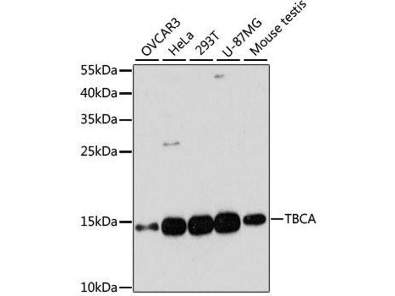 - The product of this gene is one of four proteins (cofactors A, D, E, and C) involved in the pathway leading to correctly folded beta-tubulin from folding intermediates. Cofactors A and D are believed to play a role in capturing and stabilizing beta-tubulin intermediates in a quasi-native confirmation. Cofactor E binds to the cofactor D/beta-tubulin complex, interaction with cofactor C then causes the release of beta-tubulin polypeptides that are committed to the native state. This gene encodes chaperonin cofactor A. Multiple alternatively spliced transcript variants encoding different isoforms have been found for this gene.,TBCA,Signal Transduction,Cell Biology & Developmental Biology,Cytoskeleton,Microtubules,TBCA