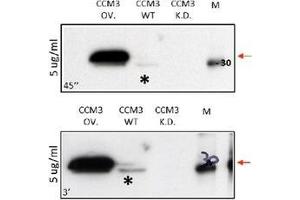 Cerebral cavernous malformations (CCMs) are sporadically acquired or inherited vascular lesions of the central nervous system consisting of clusters of dilated thin-walled blood vessels that predispose individuals to seizures and stroke. Mutations in CCM1, CCM2, or CCM3 lead to cerebral cavernous malformations, one of the most common hereditary vascular diseases of the brain. Endothelial cells within these lesions are the main disease compartments. Here, we show that adenoviral CCM3 expression inhibits endothelial cell migration, proliferation, and tube formation while down regulation of endogenous CCM3 results in increased formation of tube-like structures. Adenoviral CCM3 expression does not induce apoptosis under normal endothelial cell culture conditions but protects endothelial cells from staurosporine-induced cell death. Tyrosine kinase activity profiling suggests that CCM3 supports PDPK-1/Akt-mediated endothelial cell quiescence and survival (Schleider et al, Neurogenetics 12, 2011).Synonyms: CCM3, Cerebral cavernous malformations 3 protein, Programmed cell death protein 10, TF-1 cell apoptosis-related protein 15, TFAR15