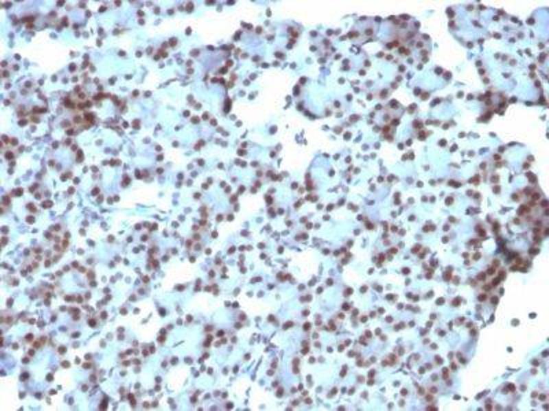 • Staining of formalin-fixed tissues requires boiling tissue sections in 10 mM citrate buffer,  pH 6.0, for 10-20 min followed by cooling at RT for 20 minutes