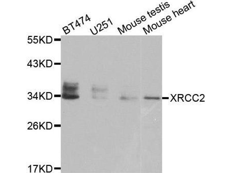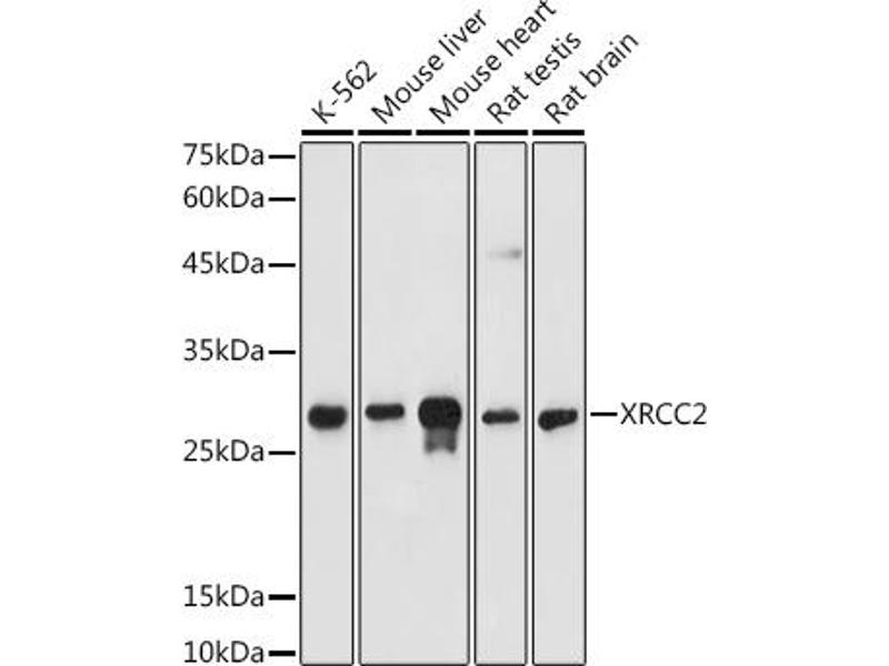 L’anticorps anti-XRCC2 Polyclonal Lapin est utilisé pour la détection de XRCC2 dans des échantillons de Humain, Souris et Rat. Il a été validé pour WB et IHC.