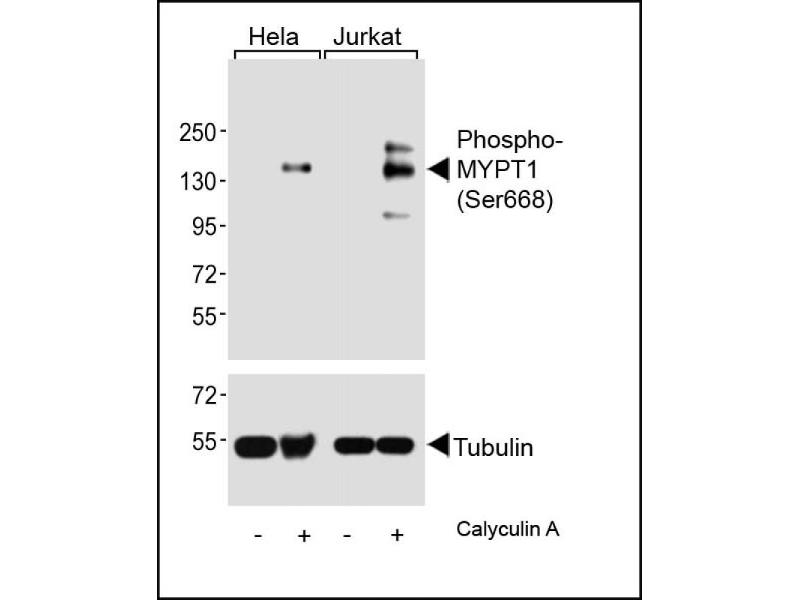 This Phospho-MYPT1 (Ser668) antibody is generated from a rabbit immunized with a KLH conjugated synthetic peptide between 641-674 amino acids from human MYPT1.