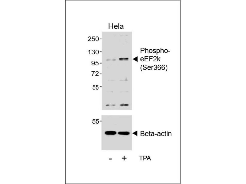 This Phospho-eEF2k (Ser366) antibody is generated from a rabbit immunized with a KLH conjugated synthetic peptide between 337-371 amino acids from the human region of human EEF2k.