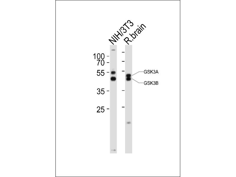This GSK3A antibody is generated from a rabbit immunized with a KLH conjugated synthetic peptide between 348-382 amino acids from the Central region of human GSK3A.