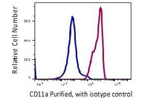 The clone recognizes a 170-180 kD alpha chain of a type I transmembrane glycoprotein also known as CD11a or LFA-1a. It is also known as LFA-1α. CD11a non-covalently associates with integrin β2 (CD18) to form LFA-1. CD11a is abundantly expressed on all leukocytes, including B and T lymphocytes, monocytes, macrophages, neutrophils, basophils and eosinophils but does not express by the non-hematopoietic tissues and platelets. Up-regulation of CD11a on activated lymphocytes is required to induce their immune response. Absence or reduced CD11a expression on tumor cells helps to escape from regular immune surveillance and it may be one of reason of in vivo tumor generation.