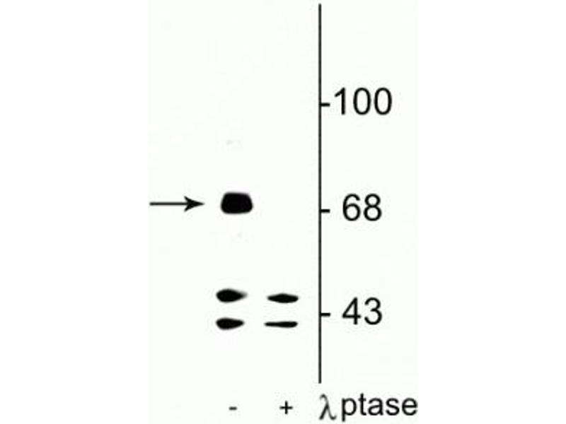 - Specific for endogenous levels of the ~71 kDa FMRP protein phosphorylated at Ser499. Immunolabeling is completely eliminated by treatment with λ-phosphatase.