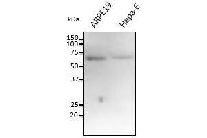 - Detects a band of 55-60 kDa by Western blot in the following canine, human, monkey, mouse, rat whole cell lysates.