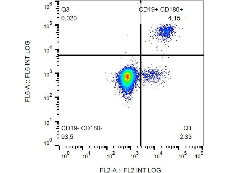 The mouse monoclonal antibody G28-8 recognizes an extracellular epitope of CD180, a 95-105 kDa TLR-like glycoprotein expressed on peripheral blood monocytes and dendritic cells, mantle zone B cells and marginal zone B cells, but very weakly on germinal center B cells.
