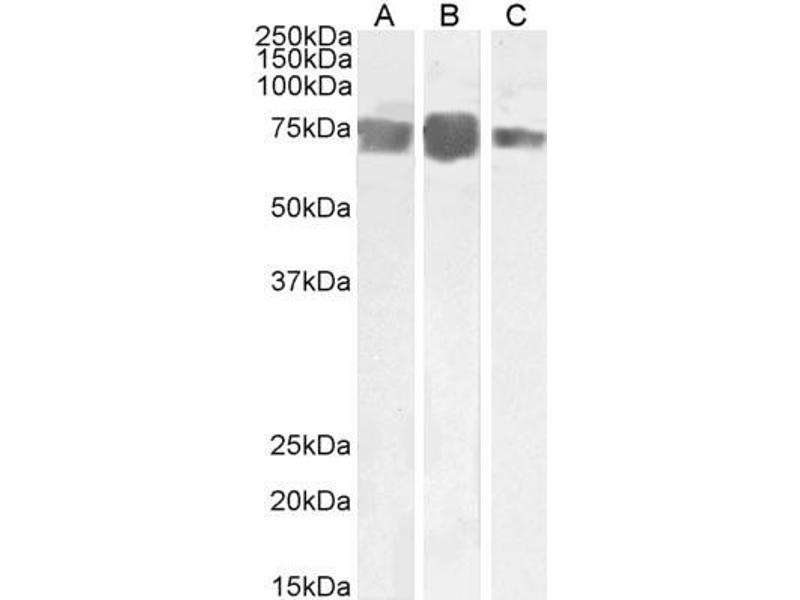 Western Blot: Approx 70-75 kDa band observed in Human Heart, Placenta and Umbilical Cord lysates (calculated MWt of 71.5 kDa according to NP_006491.2) Recommended concentration: 0.1-0.3 μg/mL.